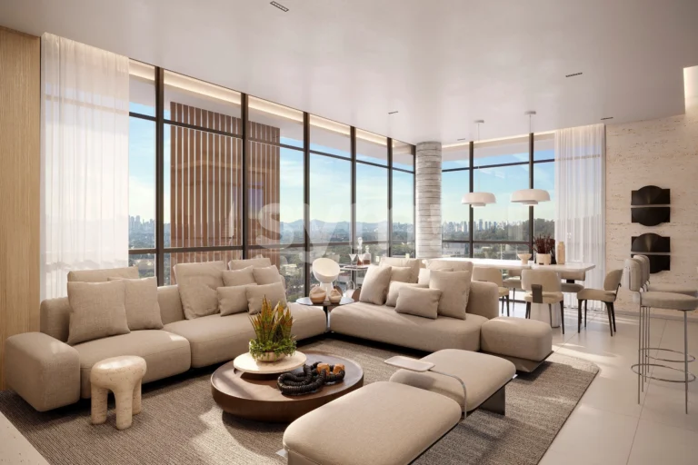 Possui elevador com acesso direto à área privativa, sacada com churrasqueira, terraço descoberto, piscina privativa, lavabo, banheiro de empregados, cinco vagas de garagem, depósito individualizado e quatro suítes, sendo uma delas a suíte master.